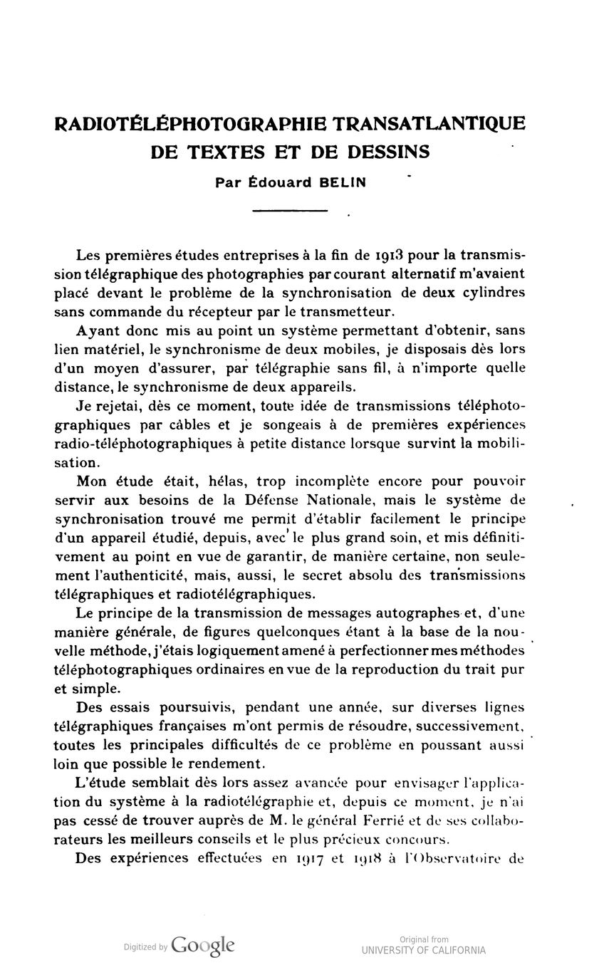 Edouard BELIN, "Radio-télégraphie transatlantique de caractères écrits ou imprimés et de dessins", L'Onde électrique, Mai 1922, pp.271-283.
