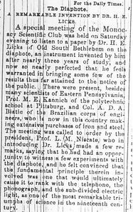 L'article "The Diaphote. A remarkable invention by Dr. H.E. Licks" est paru dans un journal (longtemps non identifié) de Pennsylvanie le 10 février 1880. Il décrit la démonstration d'un diaphote, dispositif de transmission des images à distance, qu'aurait faite au "Monacacy Scientific Club" un certain Dr. H.E. Licks. Les articles de presse successifs qui mentionneront cet appareil parleront du "Dr. Licks de Bethlehem (Pennsylvanie)". Il était donc probable que cet article de février 1880 soit paru dans un journal local de cette petite ville de la Vallée de Lehigh. Après des investigations menées en collaboration avec le Colonel Sicherman, il a pu être établi que l'article original du canular est paru dans The Daily Times, le quotidien local de Bethlehem, le 10 février 1880.
