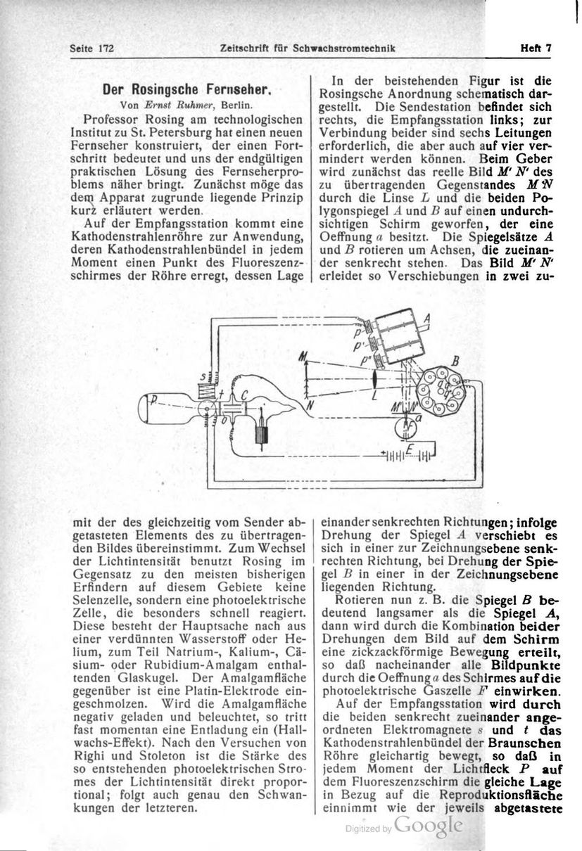 Le premier des deux textes d'Ernst Ruhmer sur le projet de téléviseur de l'inventeur russe Boris Rosing. Le second sera publié dans Die Umschau en juin 2011.