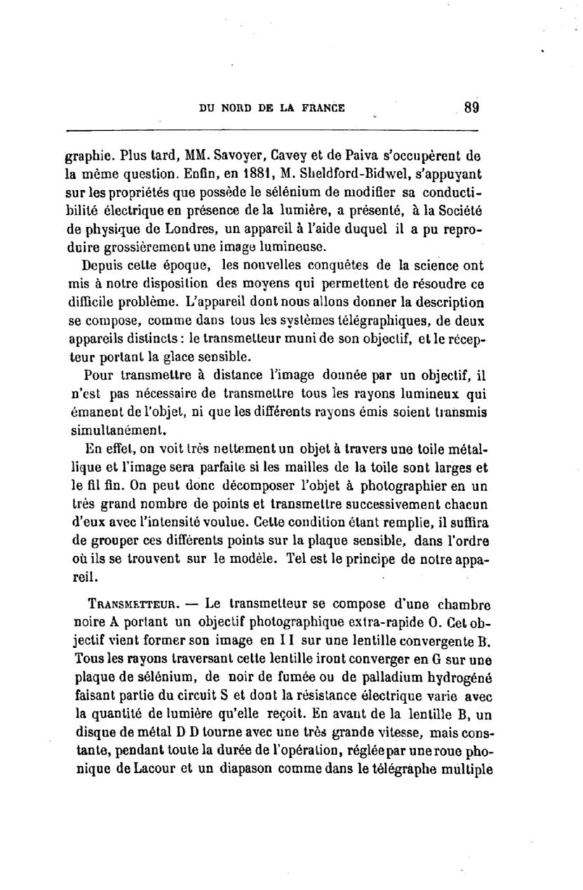 L'article commence par un bref historique avec un joli nombre de coquilles, probablement imputables au typographe plutôt qu'à l'auteur, qui n'aura pas relu les épreuves : Senbecq pour Senlecq, Savoyer pour Sawyer, Cavey pour Carey, Shelford-Bidwell pour Shelford Bidwell. Nipkow n'est pas cité.