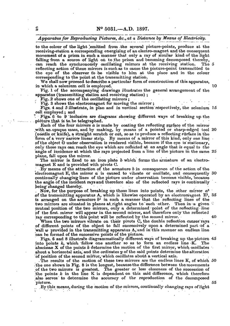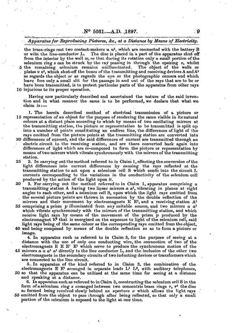 1. Le procédé décrit ici de transmission électrique d'une image ou d'une représentation d'un objet dans le but de le rendre visible dans ses couleurs naturelles à un endroit éloigné selon lequel, au moyen de deux miroirs oscillants à la station émettrice, l'image ou la représentation à transmettre est divisée en un certain nombre de points constituant une ligne sans fin, les différences de lumière des rayons émis par les points d'image à la station émettrice sont converties en différences de courant, et lesdites différences de courant sont transmises par un circuit électrique à la station réceptrice, et sont là reconverties en différences de lumière qui sont recomposées pour former l'image ou la représentation au moyen de deux miroirs qui vibrent de manière synchrone avec les miroirs de la station émettrice.